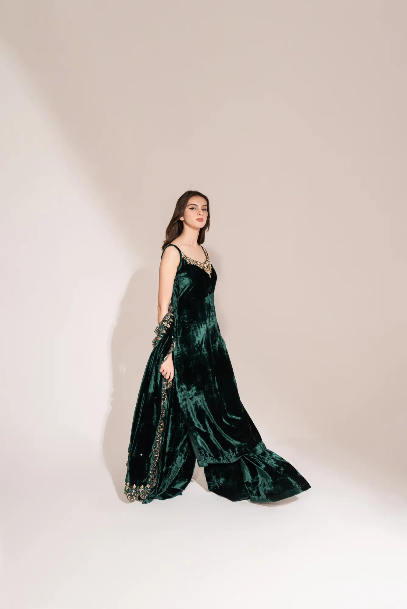 Made on velvet, this co-ord his hand embroidered with Dabka, Kora and naqshi. Paired with a hand embroidered shawl.