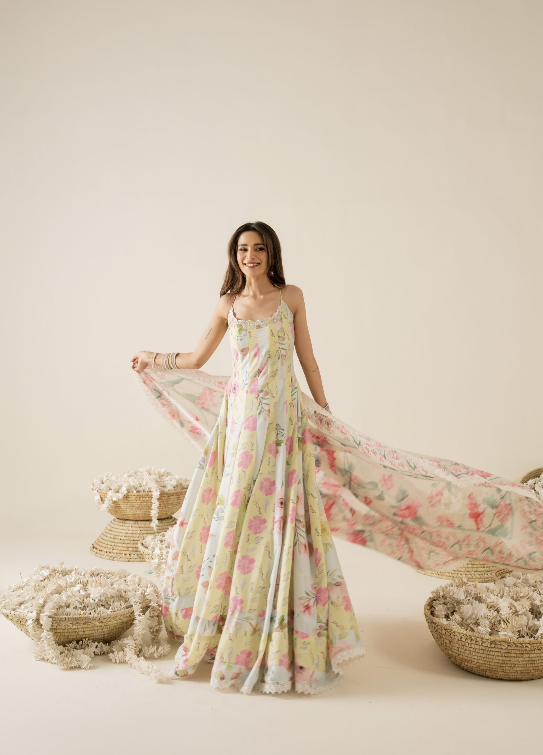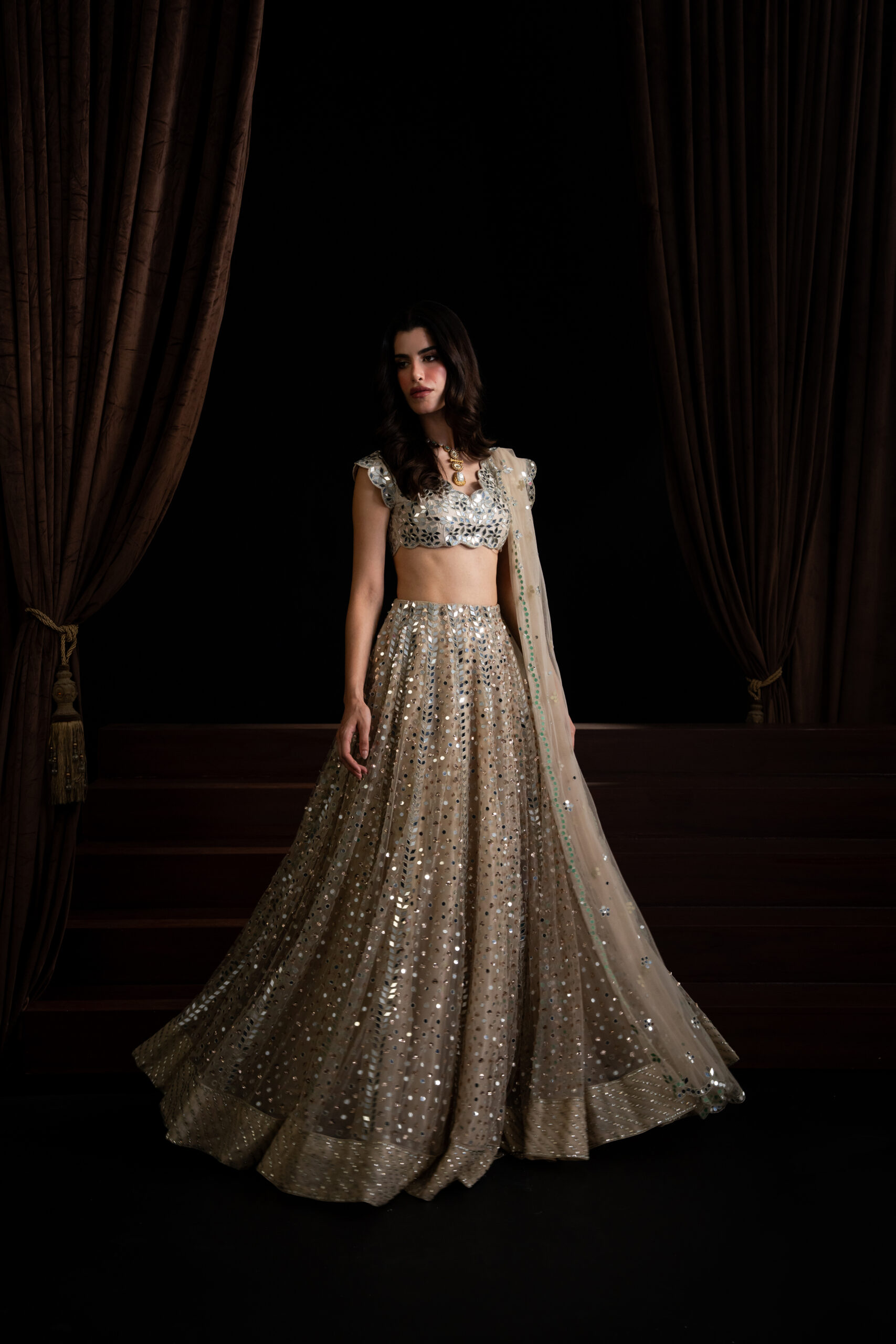 Made on net base, the lehenga is heavily embellished with mirrors, sequins, tilla and dabka kora. Paired with a raw silk blouse and net duppata. The most perfect outfit for this wedding season!